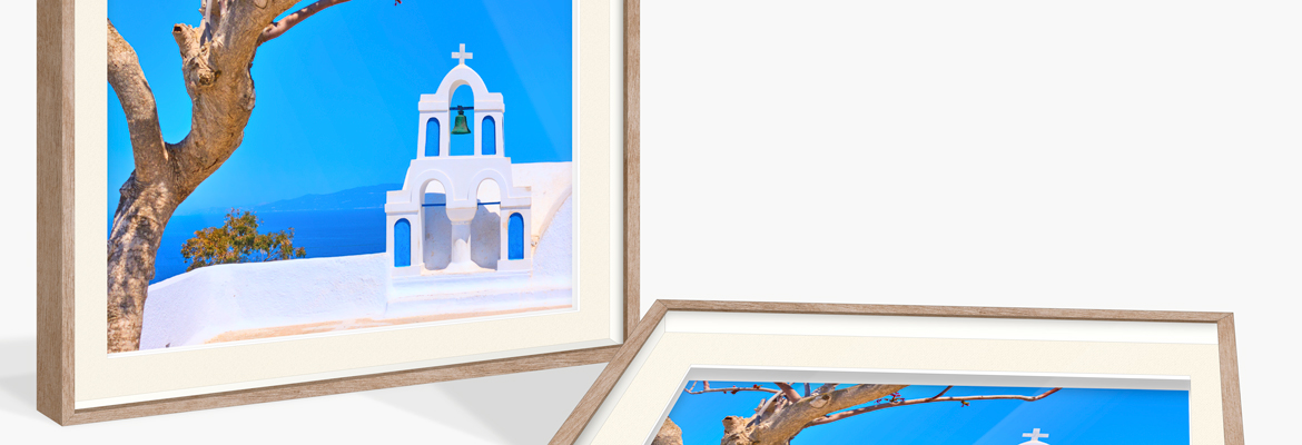De Santorini Vitrinelijst is voorzien van een Zwevende Passe-Partout die boven het beeld geplaatst wordt, dat zelf voorzien is van een witte boord van dezelfde breedte als de Passe-Partout. De kleur van de Passe-Partout is selecteerbaar.